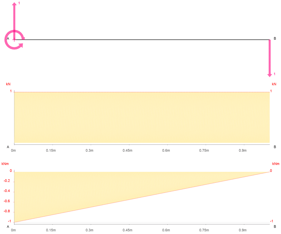 MA6 = 1.000 kNm RA6[X] = 0.000 kN RA6[Y] = 1.000 kN RB6[X] = 0.000 kN RB6[Y] = −1.000 kN |